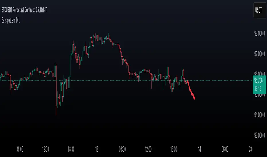 This script implements a K-Nearest Neighbors (KNN)-based machine learning model to predict future price movements in financial markets. It analyzes past price action using Euclidean distance and selects the most similar historical patterns to estimate future price changes. Unlike traditional KNN implementations, this approach optimizes distance calculations by maintaining a dynamically updated list of the closest neighbors, ensuring efficient selection without the need for sorting. The model generates a forecasted price trajectory based on incremental predictions, which are visualized on the chart using polylines for better interpretability.