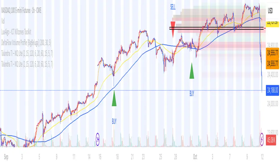Talandra TI – NQ Lite is authored by JD Harmelin, with a focus on systematic market structure and momentum-based confirmation logic. The current release is Version 1.0, first published in 2025, representing the initial implementation of price-locked execution logic and macro trend integration. All rights are reserved. Redistribution or commercial use of this script without explicit written permission is prohibited. Use of this indicator constitutes acknowledgment and acceptance of full responsibility for any trading outcomes resulting from its application.