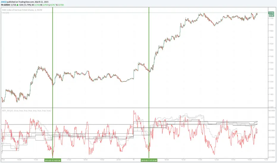 This will show you the RSI of the higher timeframes (up to 1D). Current Timeframe is colored red, higher timeframes are colored from light gray to darker gray (you can change that).