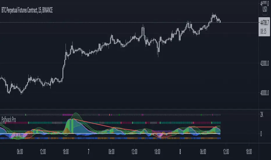 This indicator claims to be even better than Market Cipher. Turns out it uses - just as Market Cipher, freely available Indicators and puts them in a nice looking package. I packed in as much as it made sense, the original Indicator is visually very cluttered with - in my opinion, too much random stuff that I have left out for a cleaner look, for example the truckload of entry signals, MFI and that Autotrendline feature that no one really needs because the human brain is way better at drawing lines.