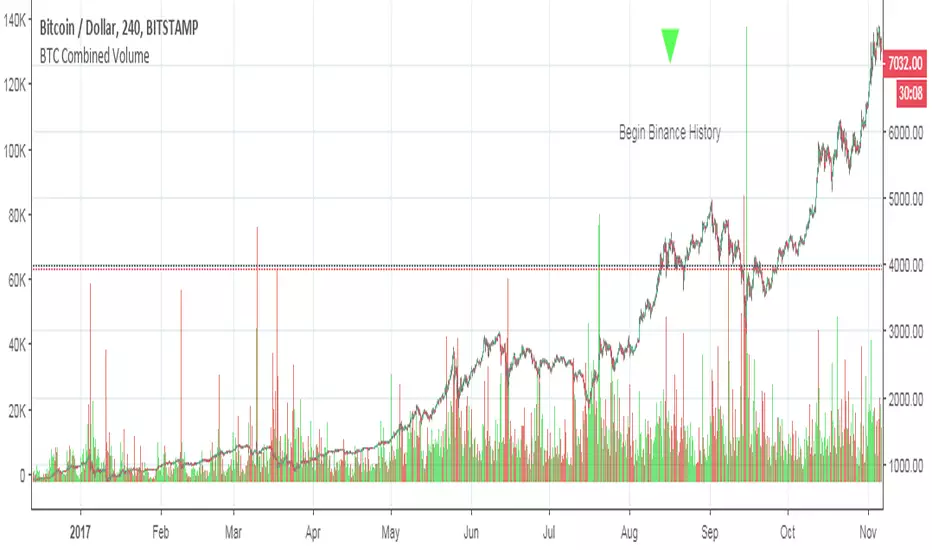 This script sums the volume for BTCUSD across several popular exchanges. I share it not so much as an indicator as a tool to use in other indicators (i.e. those that rely on volume, which often do not work very well for crypto due to the low volumes). Similar sums could easily be created for other currency, and with a little thought I could probably add the ability to parameterize the currency (e.g. type "BTCUSD" or "ETHBTC" or "LTCUSD" or whatever as an input).