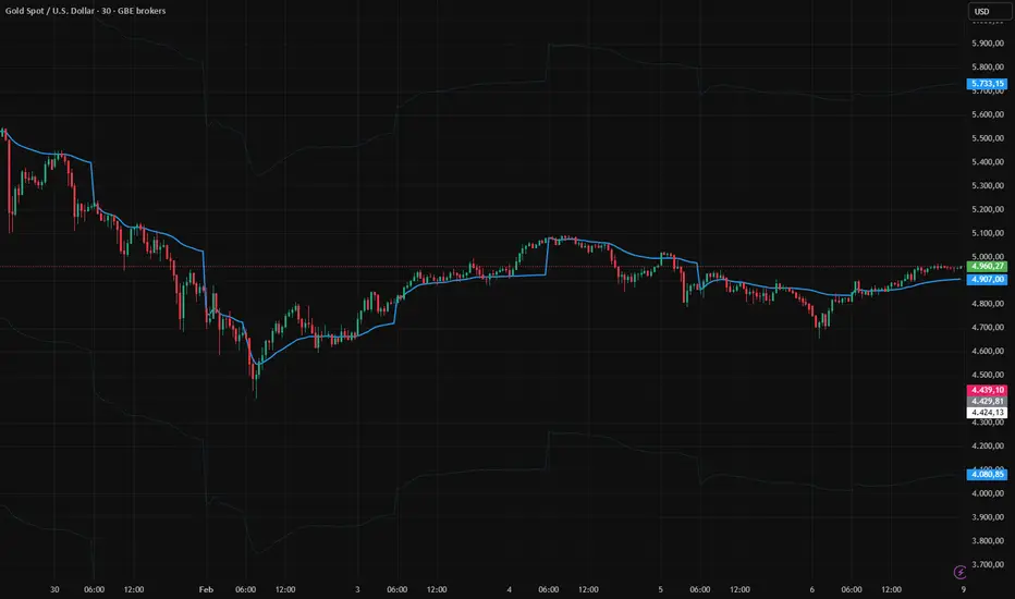 The VWAP line serves as the central reference, while the bands highlight potential overextension zones above and below the average traded price.