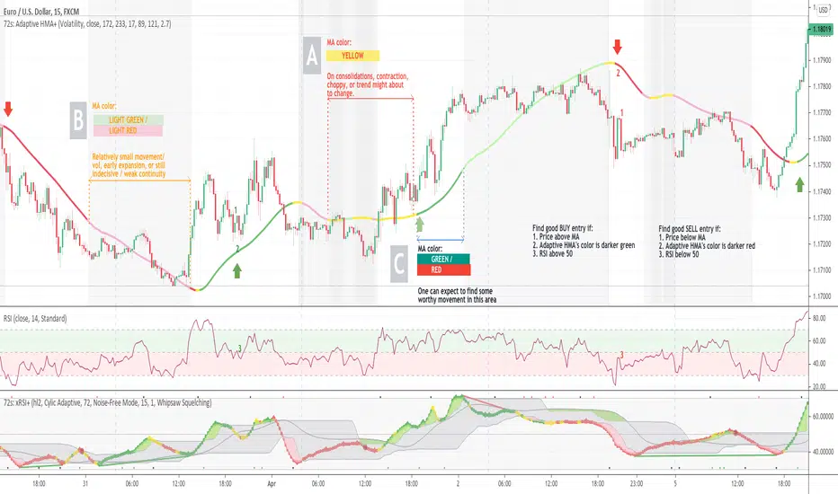 Can be use for alternative exit point or assist analysis. Consider this as a sidekick to the main/bigger/slower adaptive HMA+. Enable and set this up according to your strategy in Indicator's Settings.