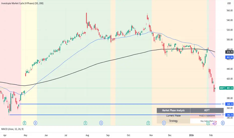 🔴 Phase 4: Markdown (Red) - Strong downtrend. Fast MA crosses below Slow MA.