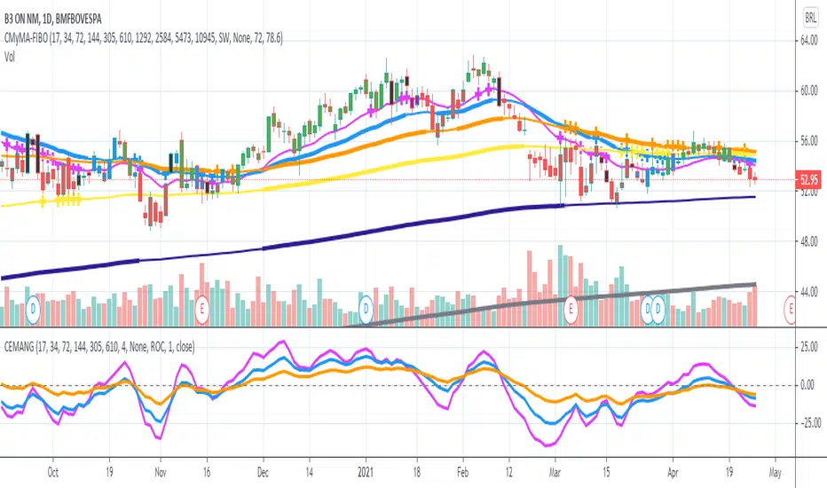 This script shows the angle of 6 EMAs to perform trade analysis. The EMA angle is also known as its Rate Of Change ( ROC ). The 6 EMAs (I, II, III , IV, V and VI ) default lengthes come from one of the Fibonacci Phi^3 and Phi^3/2 sub series (17, 34, 72, 144, 305 and 610), but can be changed to any values, particularly to the traditionally used 20, 40, 50, 100, 200 and 300. Up to my knowledge, Fibonacci Phi^3 and Phi^3/2 sub series lengthes were first proposed by Bo Williams.