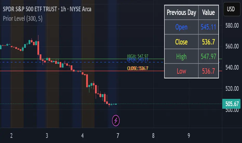 The "Prior Level" indicator displays the previous day's key price levels (Open, High, Low, Close) directly on your chart. These reference levels are essential for intraday trading strategies, support/resistance analysis, and breakout identification.