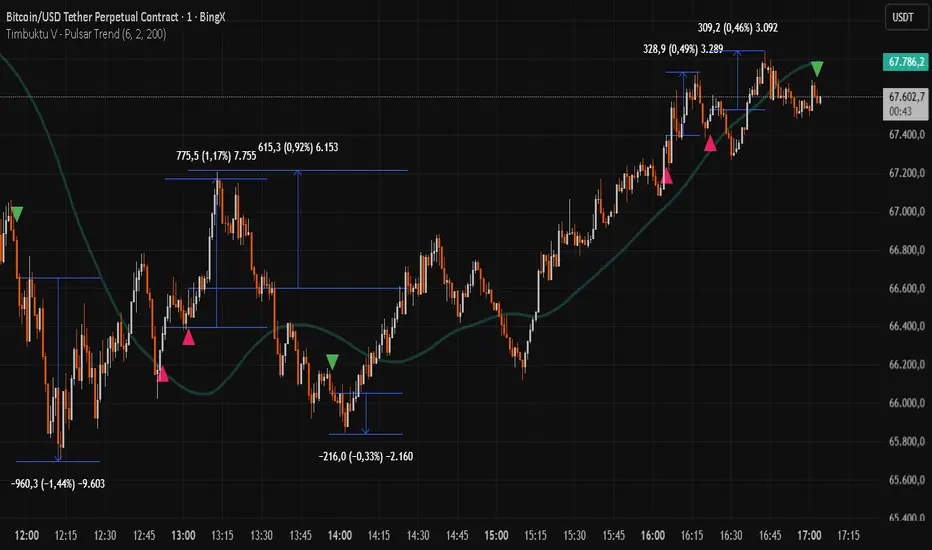 Timbuktu V - Pulsar Trend is a specialized trend-following and market structure indicator designed to pinpoint high-probability reversal points (Lower Highs and Higher Lows) by combining structural analysis with momentum filtering.