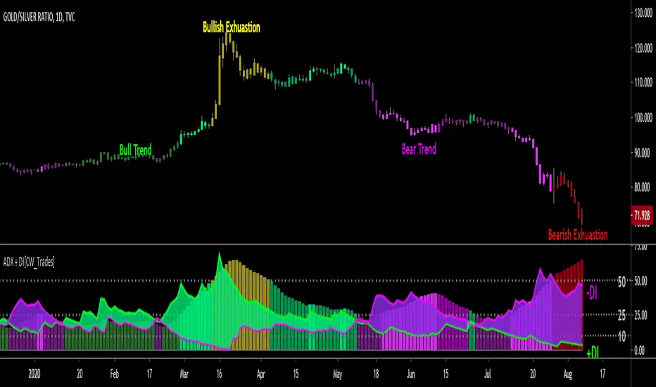 -When the ADX histogram bars are above 50 it indicates potential trend exhaustion. When the +DI is above the -DI and the ADX is above 50 the histogram will be colored yellow which indicates a potential