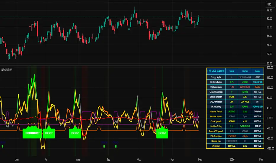 The Elite Energy Alpha Matrix indicator provides comprehensive analysis of the energy sector, focusing on the complex relationships between crude oil benchmarks, natural gas, energy-related ETFs, and the performance dynamics across various energy sub-sectors.