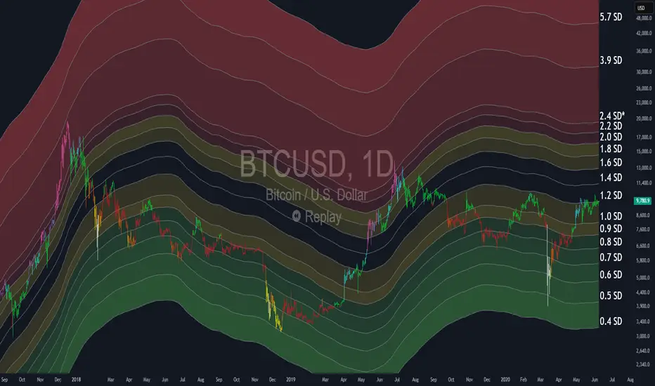 In this implementation, the resulting values are then mapped into a set of “SD style” bands that typically range from around 0.4 to 8.3 on the chart. These zones are used to highlight when price is trading well below, near, or far above its long term trend. Many traders follow these levels to help frame when they might want to focus more on accumulating versus taking profits.