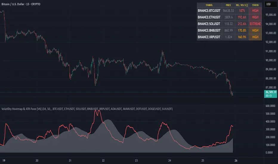 This indicator provides a comprehensive view of cryptocurrency volatility, displaying both a multi-symbol heatmap table and a synchronized ATR panel below the chart.