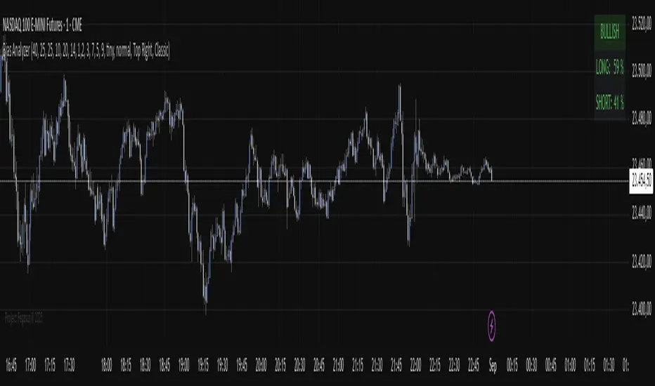 The Bias Analyzer combines multiple institutional trading concepts into a single adaptive scoring system. It calculates a directional bias score (0–100) by weighting volume, trend, structure, VWAP/imbalance, and momentum.