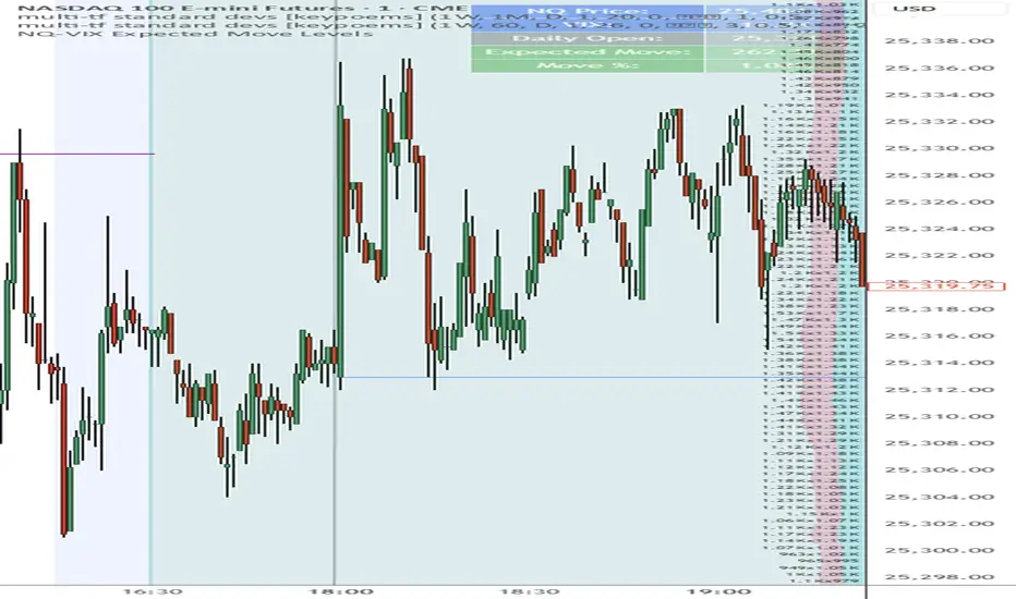 This indicator plots dynamic intraday price bands for NQ futures based on real-time volatility levels measured by the VIX (CBOE Volatility Index). The bands evolve throughout the trading day, providing volatility-adjusted price targets.