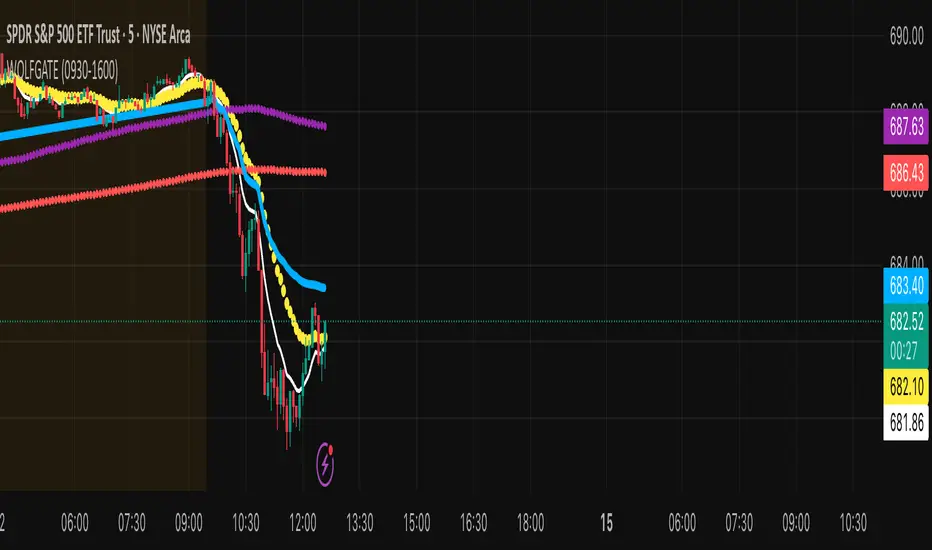 WOLFGATE is a clean, session-aware market structure and regime framework designed to help traders contextualize price action using widely accepted institutional references. The indicator focuses on structure, momentum alignment, and mean interaction, without generating trade signals or predictions.