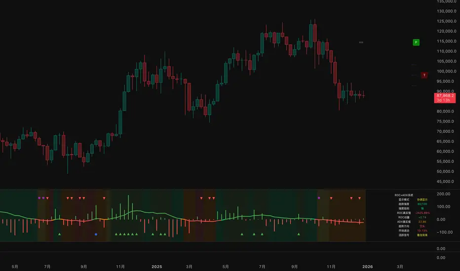 This Pine Script indicator integrates **Rate of Change (ROC)** and **Average Directional Index (ADX)** to build a professional trend-momentum trading system, which identifies trend strength, momentum changes, price divergences and generates actionable long/short trading signals for financial markets (stocks, crypto, forex). It features coordinated visual display, adaptive volatility adjustment and a comprehensive scoring mechanism for trend evaluation.