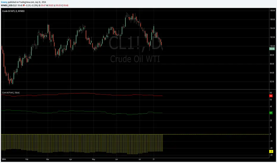 Percent of Open Interest for commercial traders from legacy commitment of traders (COT) report. For the main symbol but also allows to override it. Also allows to include options in consideration.
