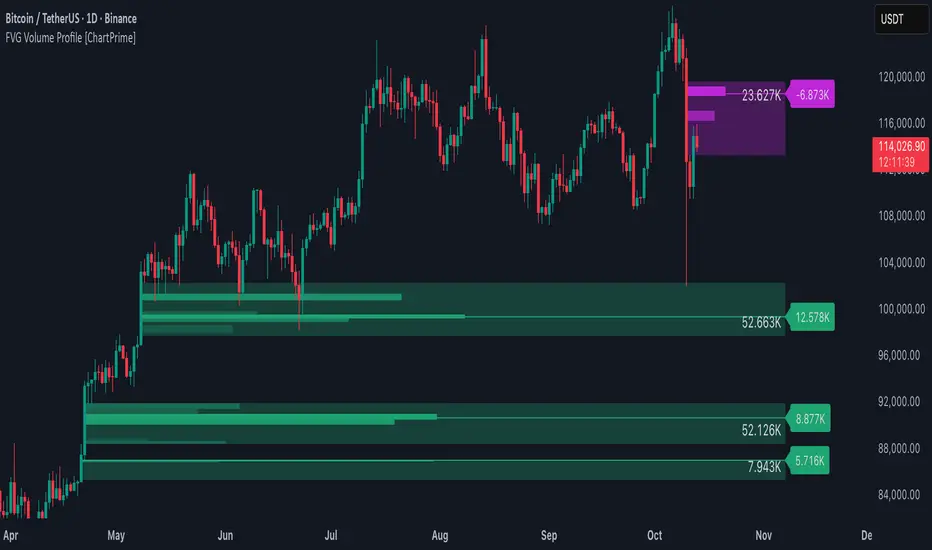 FVG Volume Profile [ChartPrime] is a smart volume analysis tool that identifies Fair Value Gaps (FVGs) and overlays a volume profile inside each gap using data from lower timeframes. The indicator automatically selects the best time resolution or allows for manual control, giving traders deeper insight into the volume structure within each imbalance. POC levels and total volumes gives a full microstructure view inside every FVG.