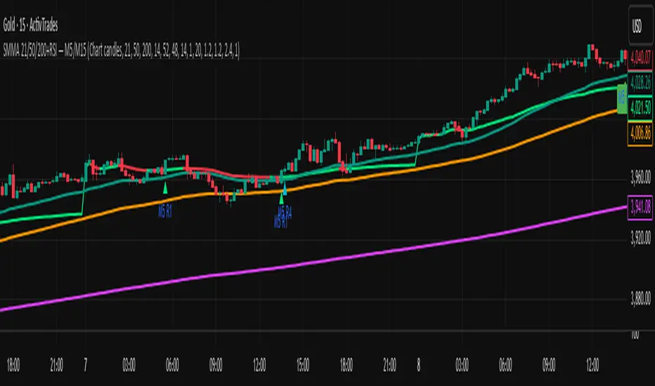 SMMA 21/50/200 + RSI — M5/M15 (Rule-marked entries & exits)