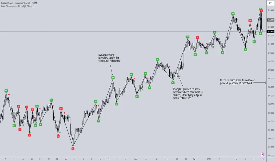 The Price Displacement Model is a market structure indicator designed to identify validated bullish and bearish reversal points using price displacement from running extremes. Signals are generated only when price moves a minimum user-defined distance away from a prior extreme and alternates direction, helping filter noise and prevent repeated same-side signals. This displacement-based approach focuses on structural shifts rather than fixed pivots or lagging fractals, making it adaptable across multiple timeframes.