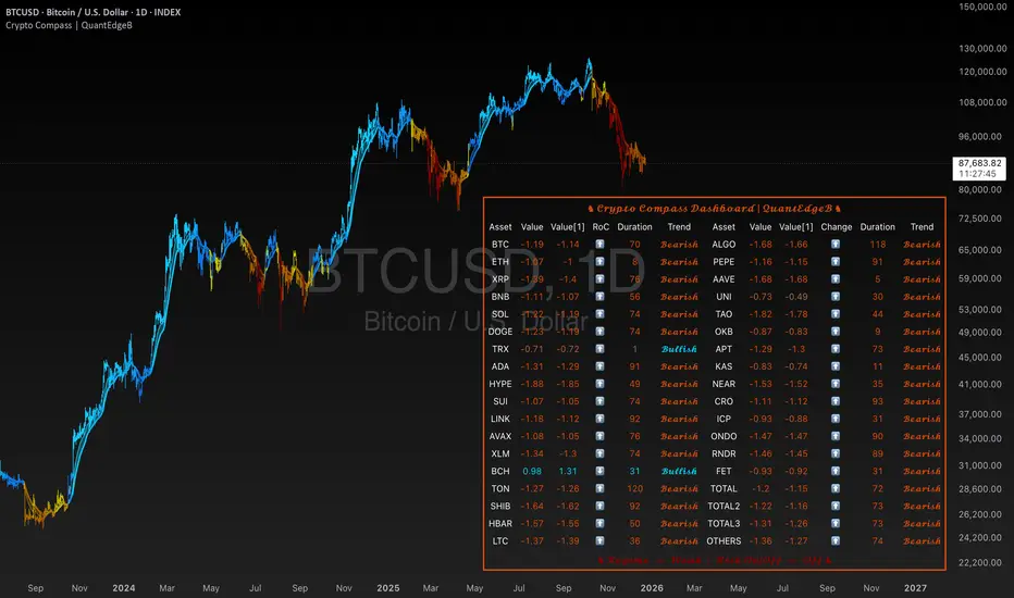 Crypto Compass | QuantEdgeB is a multi-asset market regime indicator that decodes the collective momentum and sentiment of the cryptocurrency space. By computing correlation-adjusted valuation across a basket of major tokens and blending them with the chart’s own momentum pulse, it delivers a real-time “compass” of risk-on/off regimes. Plotted as dual EMAs and color-coded candles, and accompanied by a comprehensive dashboard table, Crypto Compass guides traders through broad market cycles instead of isolated price swings.