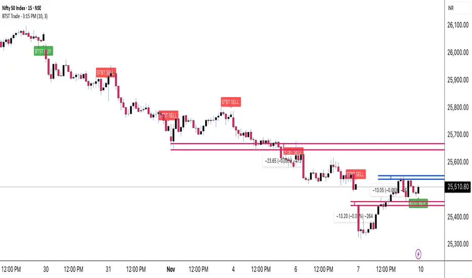 OverviewThis indicator is specifically designed for BTST (Buy Today, Sell Tomorrow) traders who want a clear directional signal at 3:15 PM, just before the market closes.