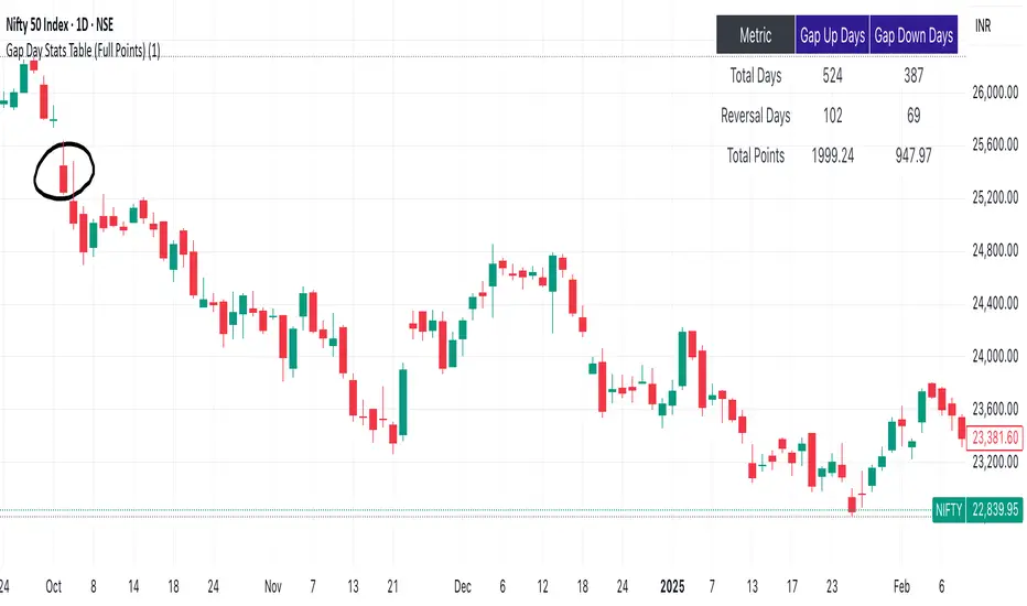 This Pine Script helps you analyze gap up and gap down days using a user-defined gap percentage threshold. It generates a real-time statistics table that tracks: