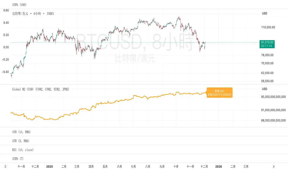 数据直观: 脚本会在图表末端生成一个标签,实时显示当前全球 M2 的具体美元总额。