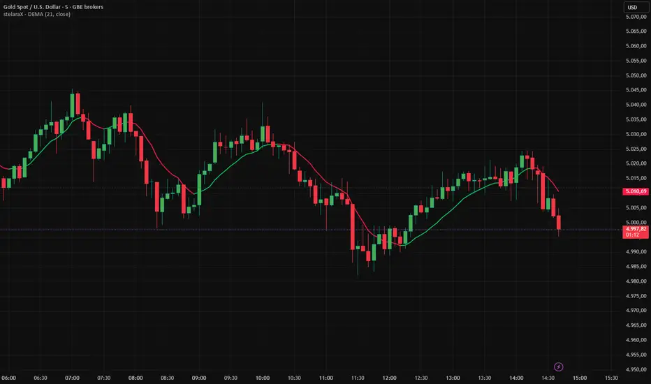 stelaraX – Double Exponential Moving Average (DEMA) is a trend-following moving average designed to reduce lag compared to traditional EMAs while preserving smooth price behavior. By combining two exponential averages, it reacts faster to trend changes without becoming excessively noisy.