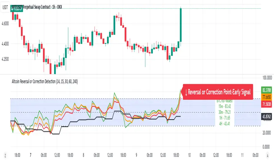 Altcoin Reversal or Correction Detection is a powerful crypto-specific indicator designed exclusively for altcoins by analyzing their RSI values across multiple timeframes alongside Bitcoin’s RSI. Since BTC's price movements have a strong influence on altcoins, this tool helps traders better understand whether a reversal or correction signal is truly reliable or just noise. Even if an altcoin appears oversold or overbought, it may continue trending with BTC—so this indicator gives you the full picture.
