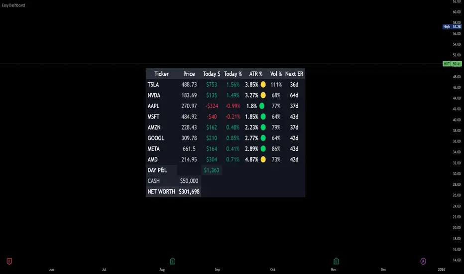 The ultimate TradingView dashboard for tracking up to 24 tickers in real-time. Stay on top of your P&L, Volatility (ATR), and Earnings countdown without ever leaving your chart.