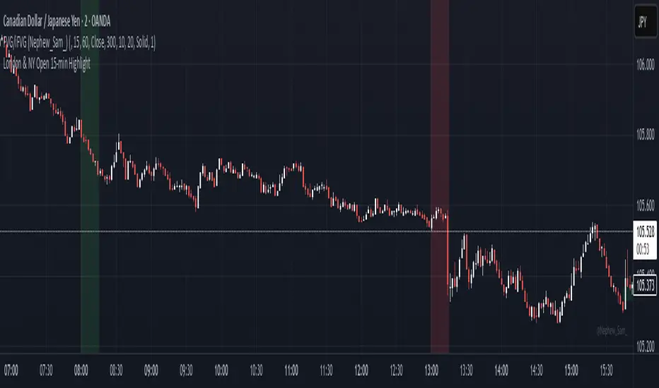 This script highlights the first 15 minutes of the London and New York trading sessions on your chart. The London session (8:00–8:15 UK time) is shaded green, and the New York session (13:00–13:15 UK time) is shaded red. It works by creating timestamps for each session and checking if the current bar falls within those times, then coloring the background accordingly.สคริปต์โอเพนซอร์ซ