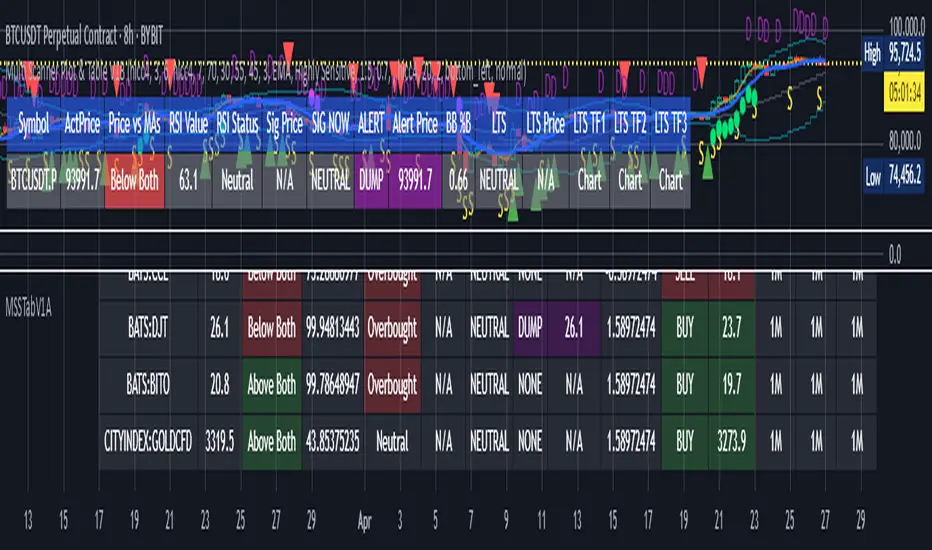 UPdated table, and user now has ability to select ALERT sensitivity levels (Highly Sensitive, Sensitive, Normal and Custom) Also table has added Actual Price and TF for time frame for calculation issues resolved. This indicator is OVERLAY TRUE so it is added to the price chart pane. Also, so script refinements added. The source code for this version is Multi Scanner Plot & Table V1A but it replaces Multi Scanner Plot & Table V1.เอกสารเผยแพร่