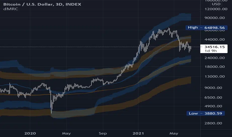 I have found most conventional channels to be either not based on "proper" volatility (e.g. standard deviation of price action for Bollinger Band), or the bottom channel to be ill adapted to the logarithmic scale and plunges to 0 on some high volatility periods, messing with readability on logarithmic auto-scaled chart.