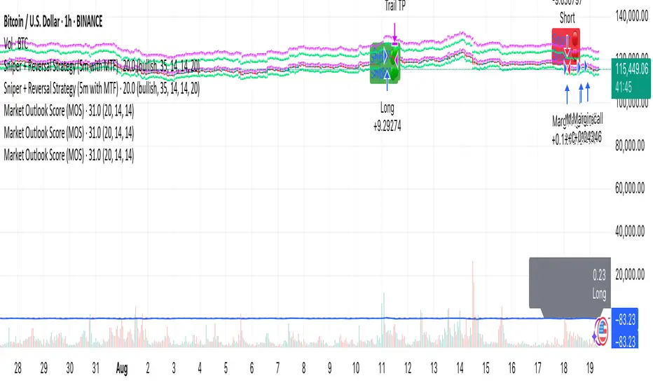 The "Market Outlook Score (MOS)" is a custom technical indicator designed for TradingView, written in Pine Script version 6. It provides a quantitative assessment of market conditions by aggregating multiple factors, including trend strength across different timeframes, directional movement (via ADX), momentum (via RSI changes), volume dynamics, and volatility stability (via ATR). The MOS is calculated as a weighted score that ranges typically between -1 and +1 (though it can exceed these bounds in extreme conditions), where positive values suggest bullish (long) opportunities, negative values indicate bearish (short) setups, and values near zero imply neutral or indecisive markets.