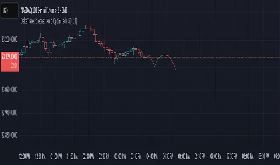 DeltaTrace Forecast is a forward-looking projection tool that visualizes the probable directional path of price using a multi-timeframe momentum model rooted in volatility-adjusted nonlinear dynamics. Rather than relying on traditional indicators that react to price after the fact, DeltaTrace estimates future price motion by tracing the progression of momentum changes across expanding timeframes—then scaling those deltas using adaptive volatility to forecast a plausible path forward.