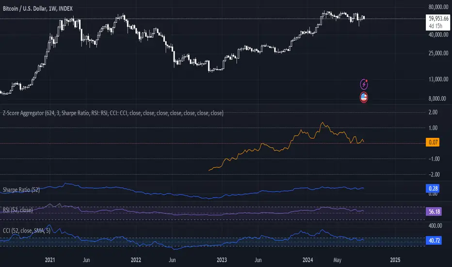 This indicator is designed to take multiple other indicators as inputs, calculate their respective Z-scores, and then aggregate these Z-scores to provide a comprehensive measure. By transforming the inputs into Z-scores, this indicator standardizes the data, enabling a more accurate comparison across different indicators, each of which may have different scales and distributions.