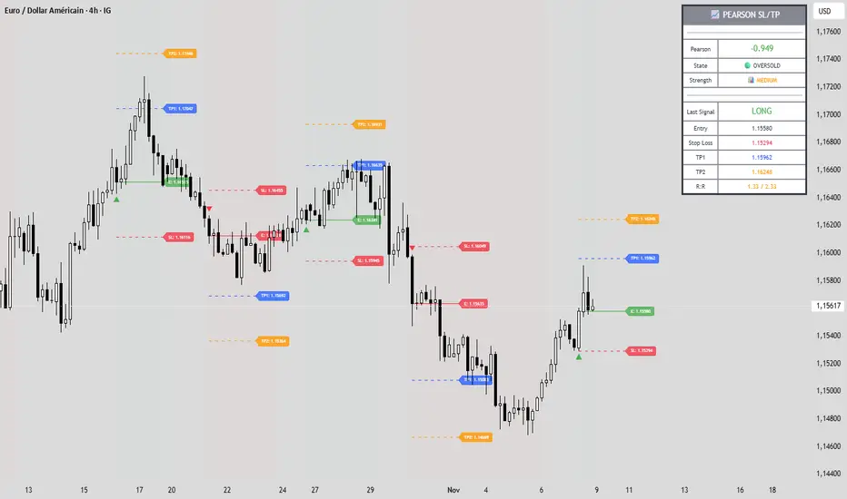 The Pearson SL/TP indicator is an advanced market analysis tool that combines Pearson correlation, volatility-based stop/target levels, and dynamic signal strength evaluation.