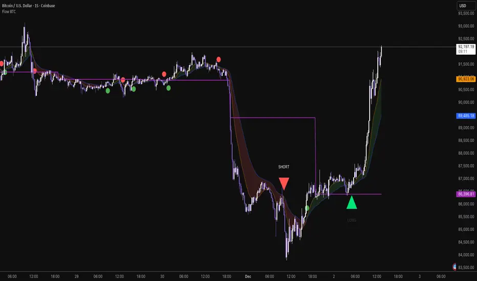 Flow BTC spots high probability Bitcoin entries on 15min. - 4hr charts using Heikin-Ashi candles and a 13/34 EMA ribbon.
