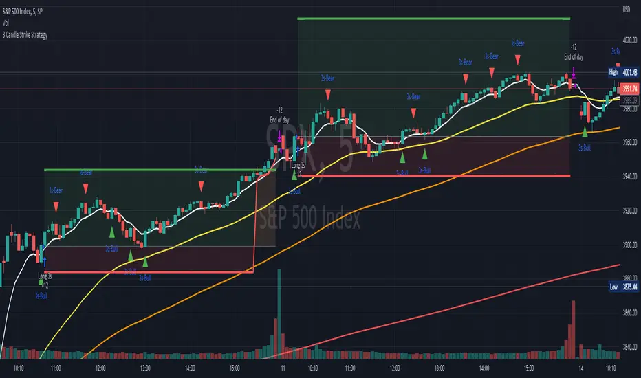 Updated with leverage parameters for back testing. It no longer estimates P/L for trading SPY options.Added alerts for all 3 Candle Strike signals, can be accessed by selecting "alert() function calls" when adding Alerts