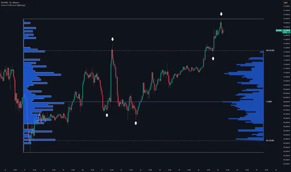The Volume Profile Area [BigBeluga] is an advanced profiling tool that calculates and visualizes the value area within a chosen period’s volume distribution. It first builds a main profile of the entire range, then constructs a secondary profile inside the defined value area, allowing traders to examine market balance and key trading zones in greater detail.
