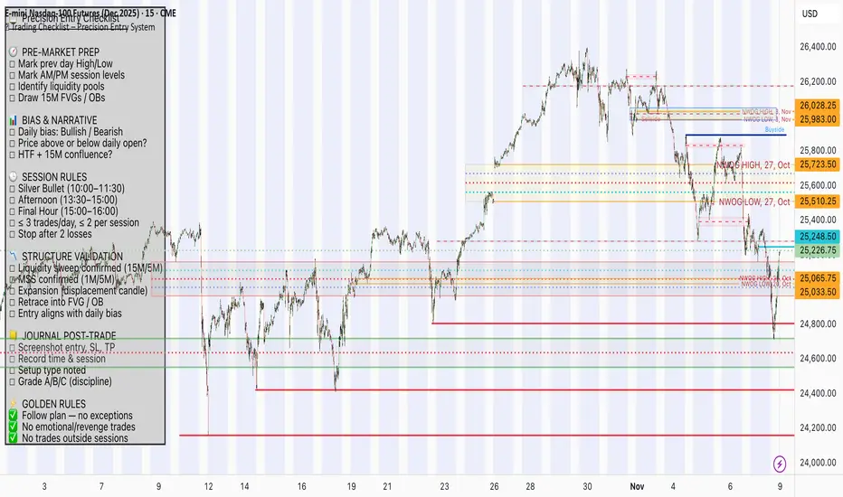 â Bias & Narrative Check: Quickly confirm daily trend, price position relative to daily open, and higher timeframe confluence.