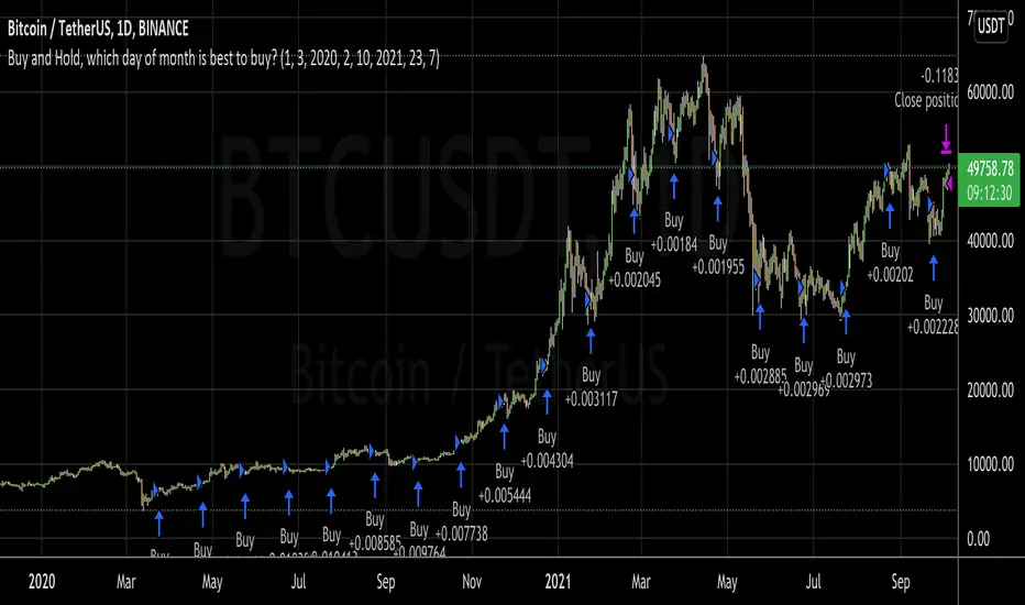 So, with this script, you can set your entry day. On the last day of the date range, it will close all positions. You can then see what amount of the asset you have accumulated to date. If you try all the days of the month and see when you can sell the most amount of the asset, you've found the best buy date of the month for that asset.