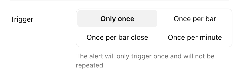 ครั้งเดียวต่อเมื่อแท่งกราฟปิด – เหมือนกันการตั้งค่าด้านบนเพียงแต่ว่า แท่งกราฟจำเป็นต้องปิดแท่งให้สมบูรณ์ก่อนที่การแจ้งเตือนจะถูกเปิดให้ทำงาน