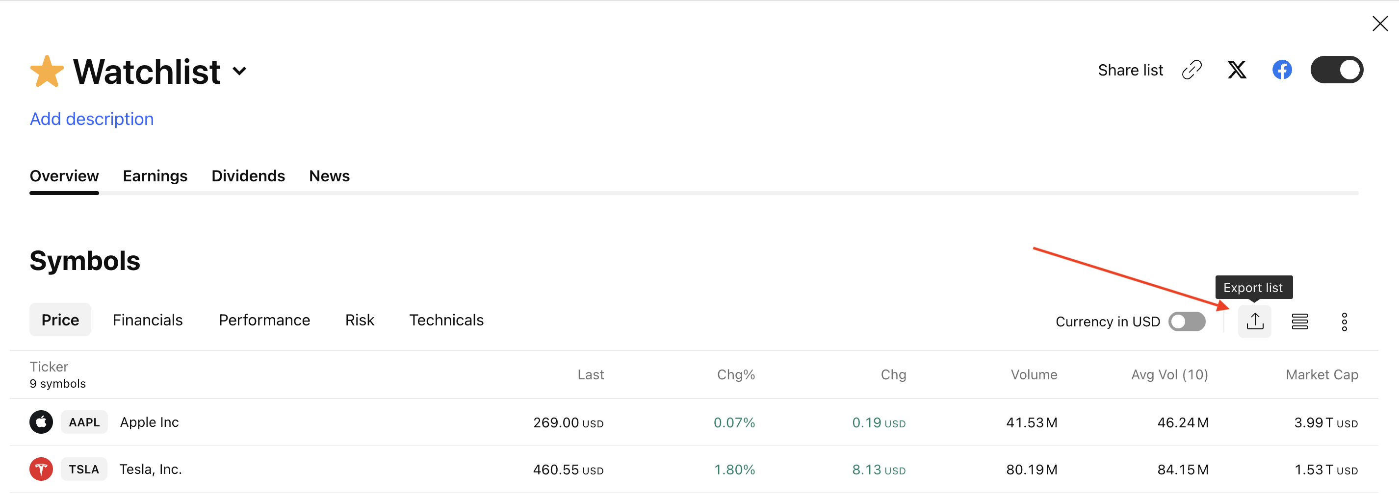ในกล่องโต้ตอบที่ปรากฏขึ้น ให้ค้นหาตารางของราคาแล้วคลิกปุ่ม ส่งออกรายการที่ติดตาม: