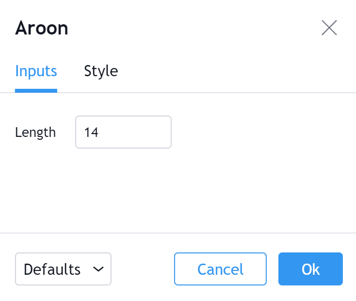 สามารถสลับการมองเห็นของ Aroon Down รวมถึงการมองเห็นของเส้นราคาที่แสดงค่าปัจจุบันที่แท้จริงของ Aroon Down.Can นอกจากนี้ยังสามารถเลือกสีความหนาของเส้นและประเภทภาพของ Aroon Down ได้ (Line เป็นค่าเริ่มต้น)