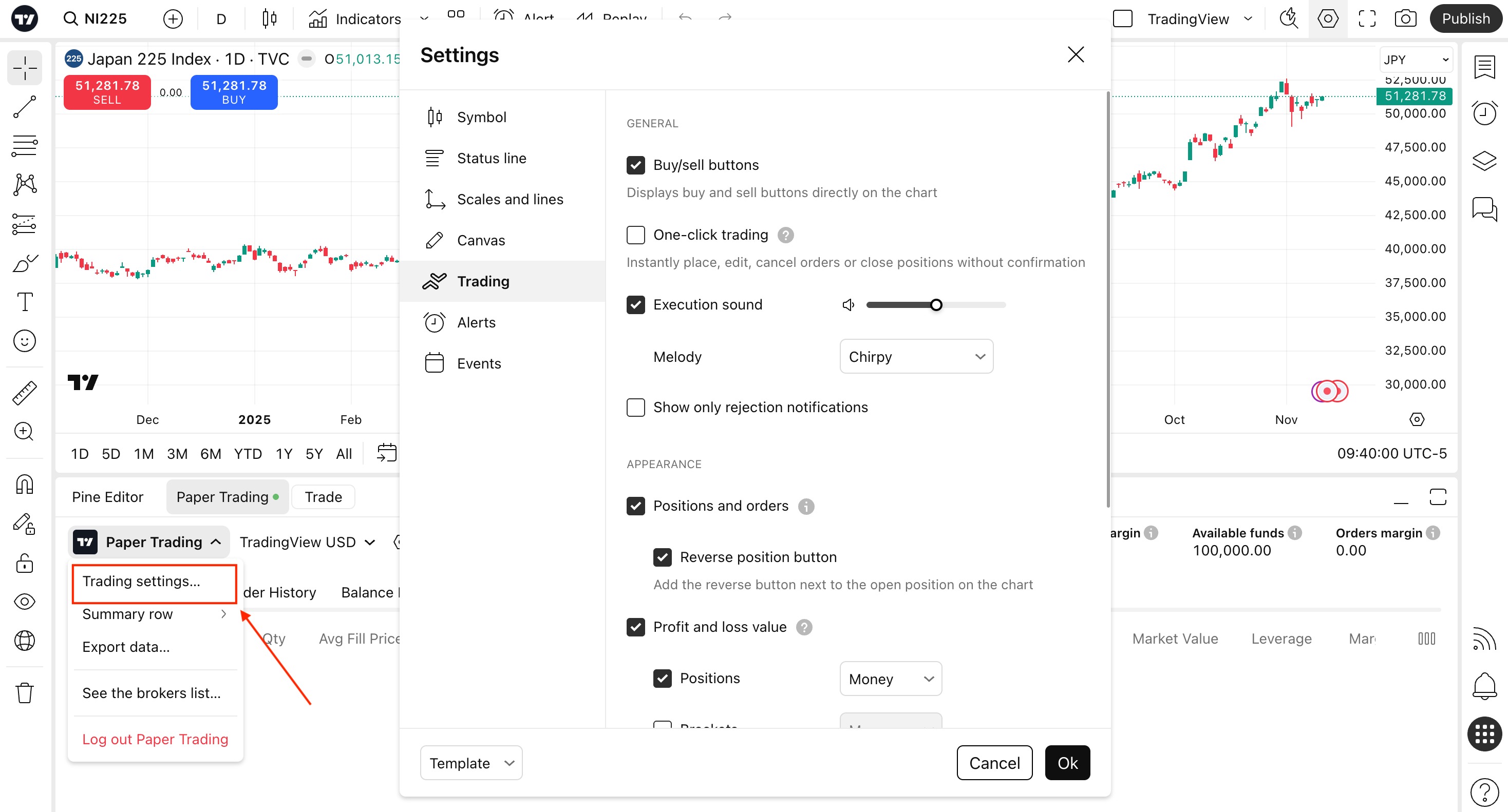 ใน "การตั้งค่าการซื้อขาย..." ให้เลือกค่าที่คุณต้องการให้แสดงบนชาร์ตของคุณ ลองเปิดและปิดปุ่ม "ซื้อ/ขาย" "สถานะ" "ออร์เดอร์" ฯลฯ ดู เพื่อหาการตั้งค่าที่คุณถนัดที่สุด