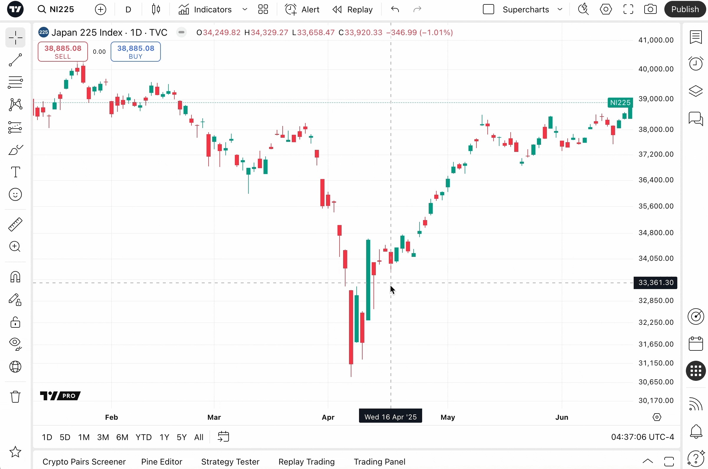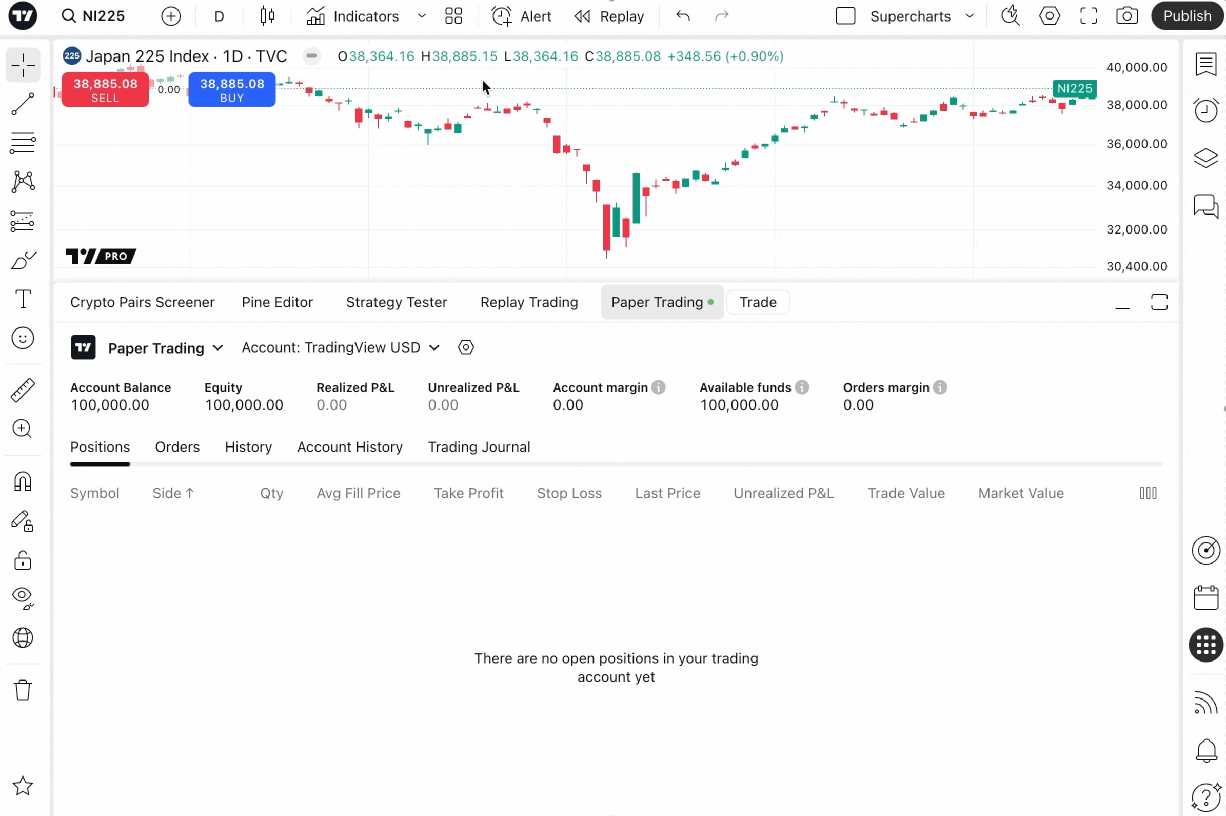 เพื่อเริ่มต้นเส้นทางการเทรดของคุณ ให้ไปที่ หน้าต่างการซื้อขาย ซึ่งอยู่ด้านล่างของ Supercharts.