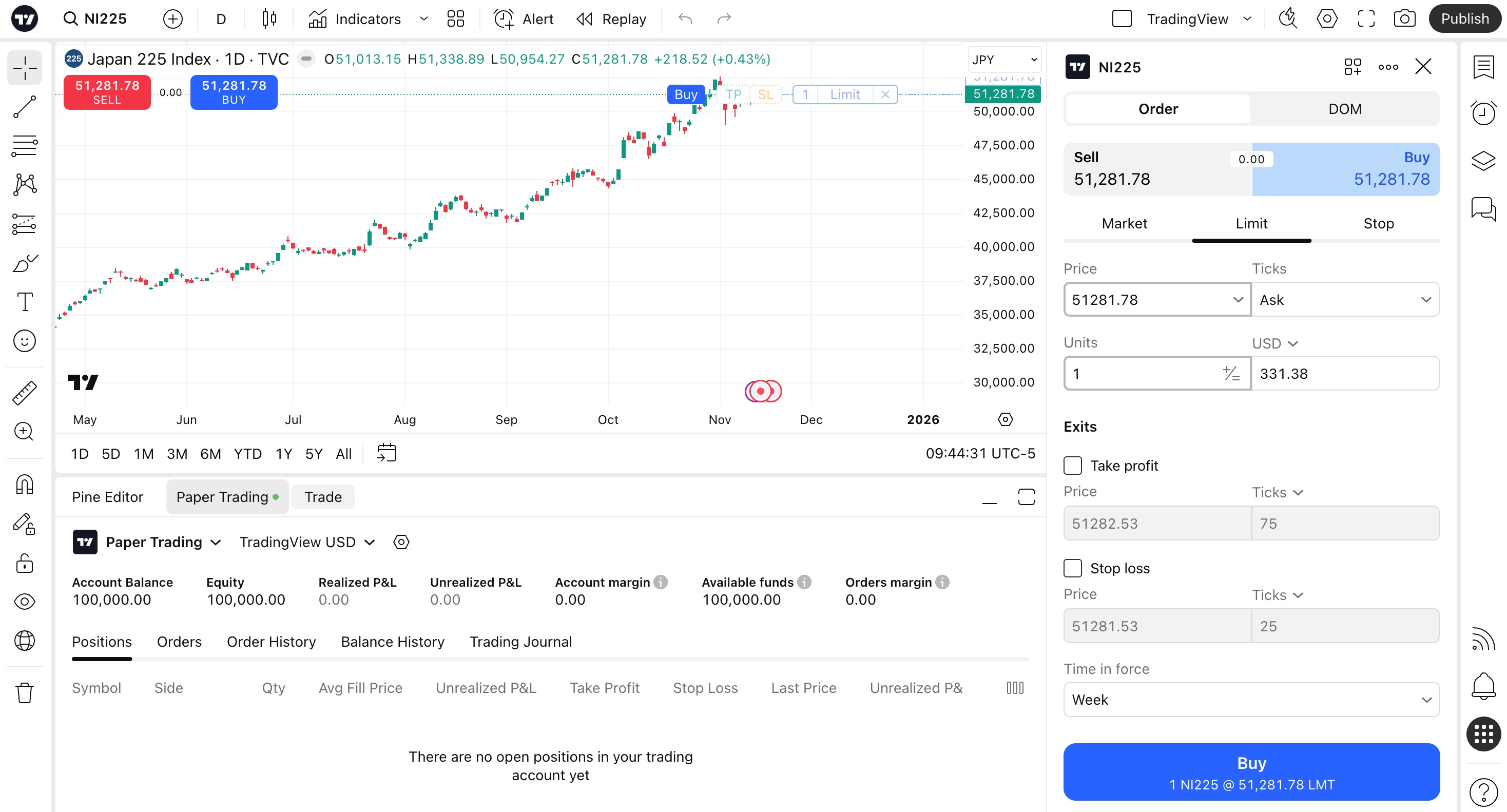 จากตรงนั้น คุณยังสามารถตั้งค่าออร์เดอร์แบบทันทีได้อีกด้วย ฟีเจอร์นี้ช่วยให้คุณสามารถวางคำสั่งซื้อและคำสั่งขายในตลาดได้ด้วยการคลิกเพียงครั้งเดียว หากต้องการเรียนรู้เพิ่มเติมเกี่ยวกับเรื่องนี้ คุณอาจต้องการศึกษา วิธีการเทรดบน TradingView — และค้นหาเคล็ดลับอื่นๆ ที่จะช่วยเพิ่มศักยภาพในการเทรดของคุณ