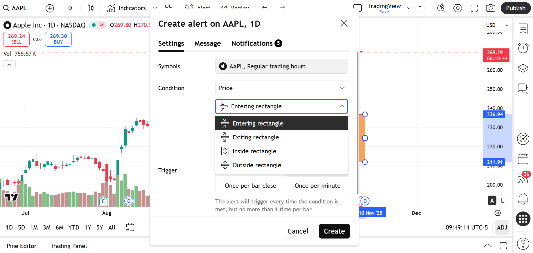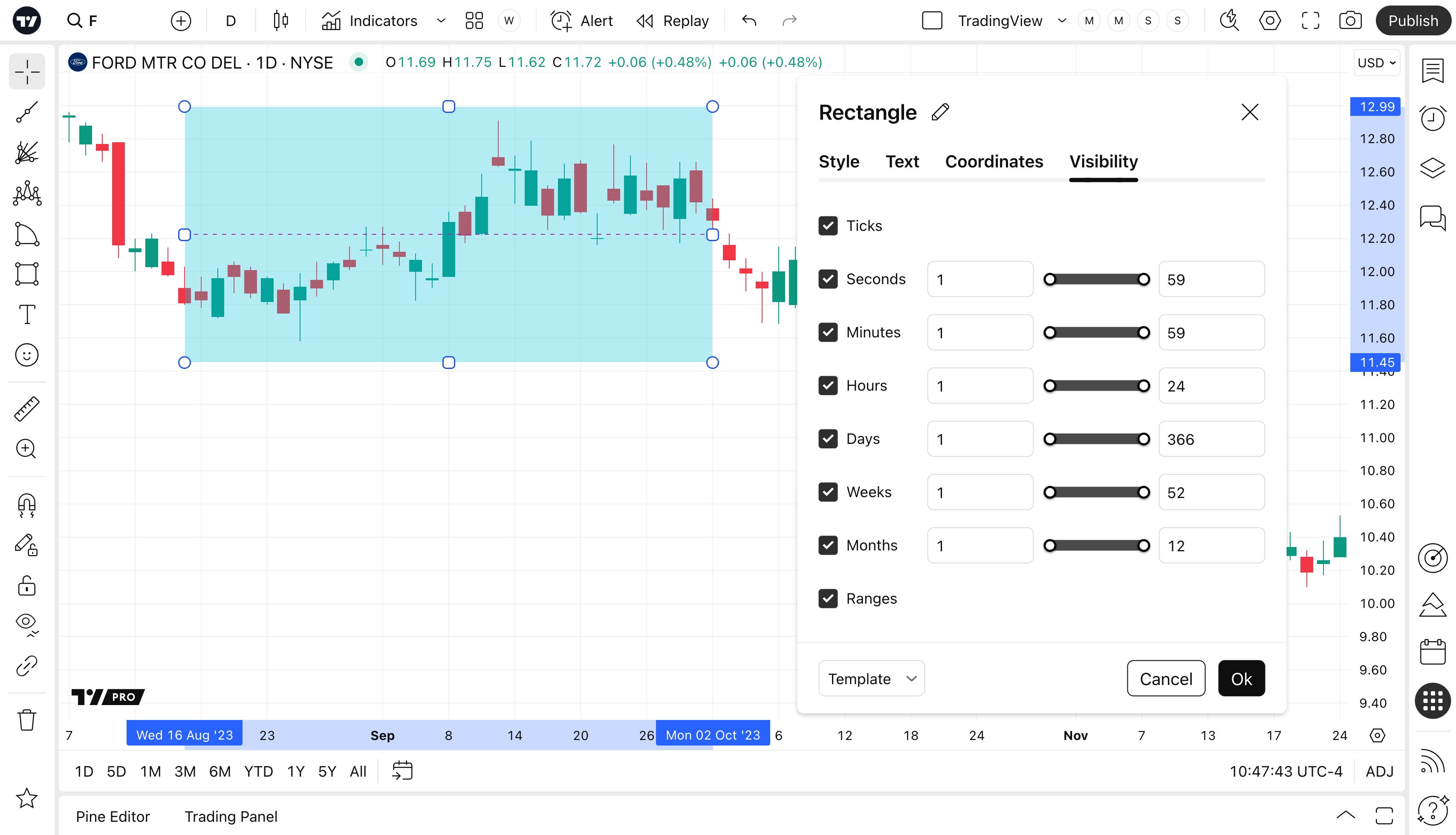 ในหน้าต่างการตั้งค่า ที่แท็บการแสดงผล คุณสามารถกำหนดค่ากรอบเวลาใดๆที่สี่เหลี่ยมผืนผ้าจะถูกแสดงบนชาร์ต