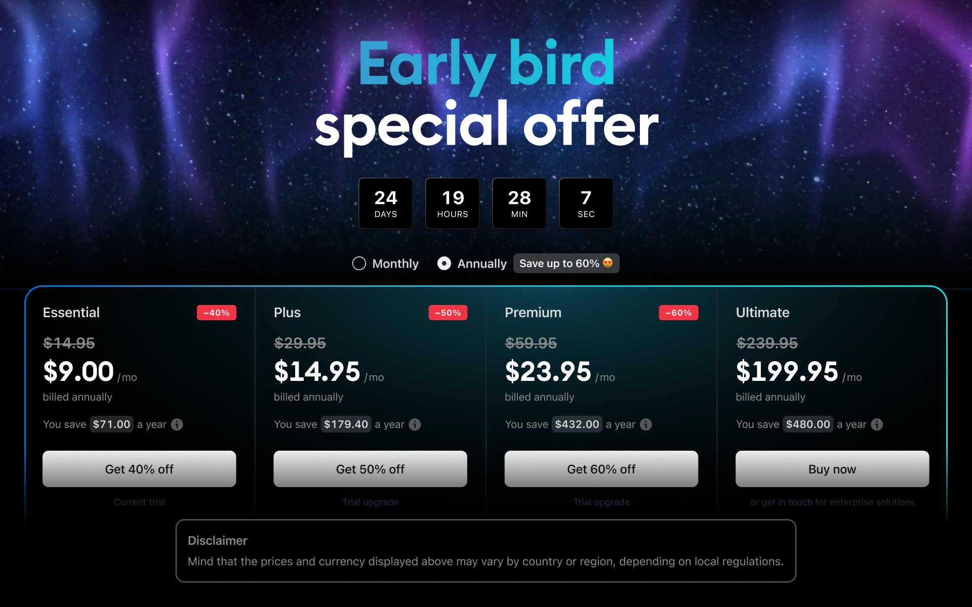 ลองนึกภาพว่าคุณกำลังทดลองใช้ Plus คุณสามารถดาวน์เกรดหรืออัปเกรดรุ่นทดลองใช้งานโดยใช้ลิงก์ที่ด้านล่างของคำอธิบายแผนแต่ละแผน